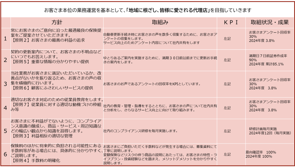 当社は、お客さま本位の業務運営を基本として、「地域に根ざし、皆様に愛される代理店」を目指していきます。